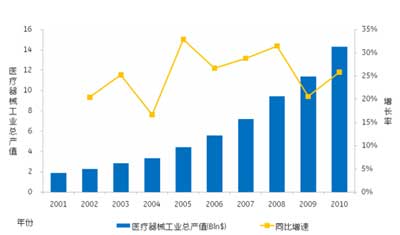 二、1/3醫(yī)療影像設(shè)備收入來自X光機(jī) 醫(yī)療器械工業(yè)分為七個(gè)子行業(yè),醫(yī)療影像設(shè)備屬于醫(yī)療診斷、監(jiān)護(hù)及治療設(shè)備制造子行業(yè)。 2010年醫(yī)療診斷、監(jiān)護(hù)及治療設(shè)備制造子行業(yè)銷售收入為42.5億美元,占比31%,其中43%的醫(yī)療診斷、監(jiān)護(hù)及醫(yī)療設(shè)備制造子行業(yè)收入來源于醫(yī)療影像設(shè)備。 根據(jù) 鄧白氏多年對(duì)中國(guó)X光機(jī)設(shè)備的研究,2010年我國(guó)市場(chǎng)容量5.9億美元,約占醫(yī)療器械行業(yè)產(chǎn)值貢獻(xiàn)率4%,占醫(yī)療影像設(shè)備的32%,其2008-2010年復(fù)合增長(zhǎng)率達(dá)到11.4%。 三、X光機(jī)市場(chǎng)發(fā)展趨勢(shì) 十二五規(guī)劃指出:數(shù)字化X射線機(jī)列入重點(diǎn)發(fā)展的產(chǎn)品領(lǐng)域;普及型數(shù)字化X線機(jī)成為社區(qū)和農(nóng)村基層應(yīng)用的普及型醫(yī)療器械,產(chǎn)品應(yīng)具有低成本、易于掌握、安全性好、可靠性高、可附帶解決方案并易于維護(hù)等特點(diǎn);數(shù)字化探測(cè)器、高頻X線發(fā)生器、X線球管成為醫(yī)學(xué)成像設(shè)備重點(diǎn)發(fā)展技術(shù)。 X光機(jī)發(fā)展受到行業(yè)、政策、競(jìng)爭(zhēng)和用戶等方面的驅(qū)動(dòng),未來5年,將保持快速增長(zhǎng),基層醫(yī)院將成為該產(chǎn)品主要競(jìng)爭(zhēng)市場(chǎng)。 |