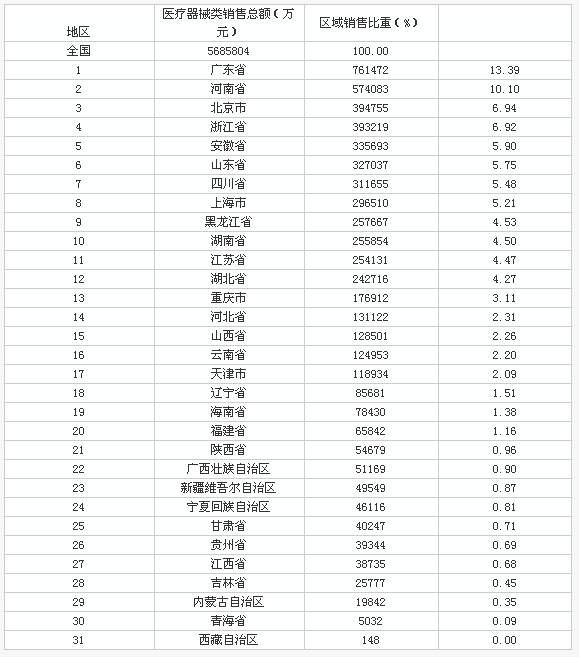 醫療器械網訊,6月3日,商務部發布《2015年藥品流通行業運行統計分析報告》,對藥品流通行業整體規模、藥品批發和零售企業銷售和經營等情況進行了統計分析,并對行業發展的趨勢進行了預測。 以下是涉及醫療器械2015年在各省的銷售額統計表。