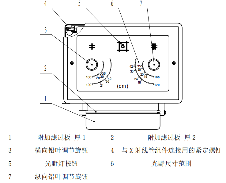 其內部主要有傳動裝置、橫向可變鉛葉、縱向可變鉛葉;外部主要有鉛葉開合調節(jié)旋鈕、光野燈按鈕和與X射線管組件連接的接口等部分組成。