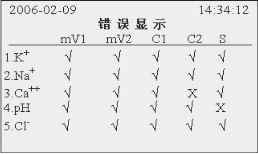 (1)開機:將儀器后面板上電源開關置于“開位置”(ON端),此時顯示屏顯示自檢。 (2)自檢:首先儀器檢查進樣針是否到位,不到位會提示“請放下進樣針”。然后檢查有無吸入斜率液和定標沖洗液,如果未吸入會顯示“無斜率液”或“無定標液”。自檢結束后進入預備狀態。 (3)定標:預備狀態下按“校正1”或者“校正2”按鍵,儀器會吸入定標/沖洗液和斜率液自動進行定標。定標完成后會進入“就緒界面”。儀器在此界面才可以進行測量。儀器剛開機因為電極工作不穩定,可能會有錯誤提示,需要預熱1小時左右并多次按“校正1”或者“校正2”按鍵進行沖洗和定標。 (4)設置:按“服務程序”按鍵進入設置菜單,根據用戶的需要,進行“使用模式”“睡眠時間”“日期和時間”“清洗間隔時間”“打印設置”等設置。以上各項在儀器出廠時已有默認設置。 (5)錯誤顯示:儀器在剛開始定標時可能會顯示“×無終點”,需要按“服務程序”按鍵再按2號鍵進入“錯誤顯示”界面來檢查。如果是鉀鈉氯鈣等各項的S值都顯示“×”,則是參比電極內有氣泡,需要取下參比電極彈出氣泡。如果是其中一項的S值顯示“×”,則是對應電極內有氣泡,需要取下此電極彈出氣泡