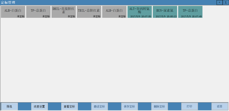 試劑在檢測樣本前都須做定標(biāo),單擊菜單欄中定標(biāo)的圖標(biāo)進(jìn)入定標(biāo)單元。進(jìn)入頁面顯示所有的項目,并顯示項目的定標(biāo)狀態(tài)。如下圖,未定標(biāo)的項目顯示灰色,已定標(biāo)的項目顯示綠色。PUZS-6000A全自動生化分析儀定標(biāo)方法有: 1、線性回歸法 2、二次方曲線 3、三次方曲線 4、三次方樣條 5、四參數(shù)法 6、Logit-Log 7、比值半對數(shù)法 8、全對數(shù)法 9、折線法 10、因數(shù)法