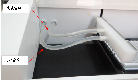 儀器洗板噴頭的連接如下圖所示。將洗液管路與廢液管路分別與洗板噴頭上的洗液管接頭與廢液管接頭相連接。
