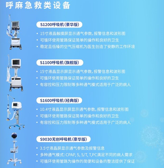 一、醫學影像設備 移動DR 動態DR 固定DR 雙立柱DR 動態DRF 二、檢驗類設備 全自動生化儀 凝血分析儀 血氣生化分析儀 血氣電解質分析儀 酶標分析儀 洗板機 特定蛋白分析儀 血糖儀 三、呼麻急救類設備 有創呼吸機 無創呼吸機