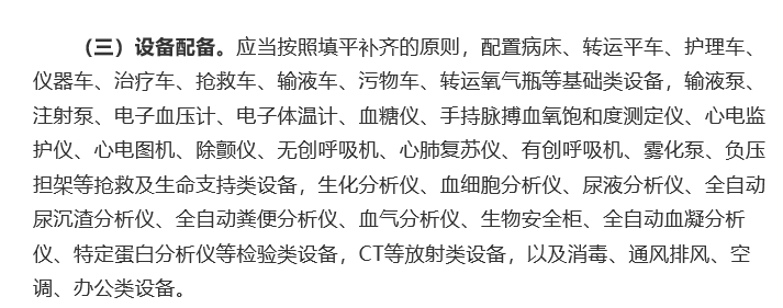 發熱門診的建立 ,是為了防止醫院感染 ,加強患者發病初期判斷的重要舉措 ,是排查救治新冠肺炎疑似患者的首道關口。衛生健康委辦公廳于2020年6月30日印發了關于《完善發熱門診和醫療機構感染防控工作的通知》,在通知中強調進一步規范發熱門診的建設和管理。其中包括了對位置的要求、分區的設置、醫療設備配備、人員配置和管理要求。 在設備配置上,發熱門診應當按照填平補齊的原則,配置病床、轉運平車、護理車、儀器車、治療車、搶救車、輸液車、污物車、轉運氧氣瓶等基礎類設備,輸液泵、注射泵、電子血壓計、電子體溫計、血糖儀、手持脈搏血氧飽和度測定儀、心電監護儀、心電圖機、除顫儀、無創呼吸機、心肺復蘇儀、有創呼吸機、霧化泵、負壓擔架等搶救及生命支持類設備,生化分析儀、血細胞分析儀、尿液分析儀、全自動尿沉渣分析儀、全自動糞便分析儀、血氣分析儀、生物安全柜、全自動血凝分析儀、特定蛋白分析儀等檢驗類設備,CT等放射類設備,以及消毒、通風排風、空調、辦公類設備。