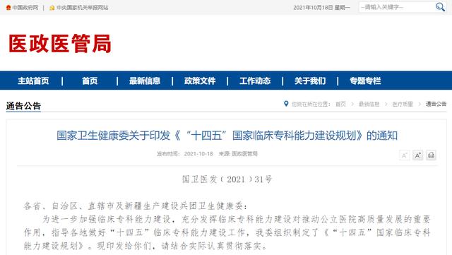 10月18日,衛健委發布了《“十四五”臨床專科能力建設規劃》。規劃指出,要從建設國際高水平臨床專科、普遍提升主要臨床專科能力、促進臨床專科能力均衡發展以及補齊薄弱專科資源短板四個方向建設臨床專科能力。(來源:衛健委)