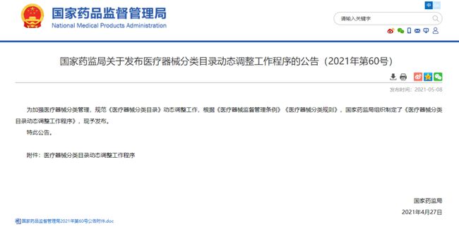 藥品監督管理局發布了《關于醫療器械分類目錄動態調整工作程序的公告(2021年第60號)》,醫療器械分類管理目錄將更加科學、合理、規范。