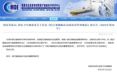 2022年3月31日,為深化醫療器械審評審批制度改革,加強醫療器械臨床試驗管理,根據《醫療器械監督管理條例》(國務院令第739號)及《醫療器械注冊與備案管理辦法》(市場監管總局令第47號)、《體外診斷試劑注冊與備案管理辦法》(市場監管總局令第48號),藥品監督管理局會同衛生健康委員會組織修訂了《醫療器械臨床試驗質量管理規范》,現予發布,自2022年5月1日起施行。