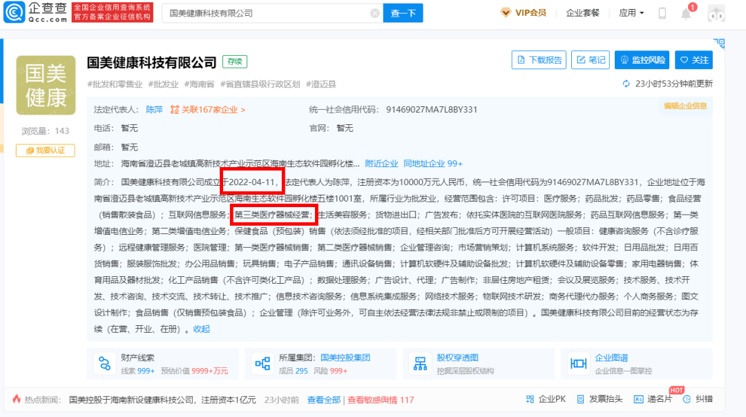 抖音電商宣布新增醫(yī)療器械銷售品類的四天后,國美也正式入局三類醫(yī)療器械。據(jù)企查查APP顯示,4月11日,國美健康科技有限公司成立,法定代表人為陳萍,注冊資本1億元。